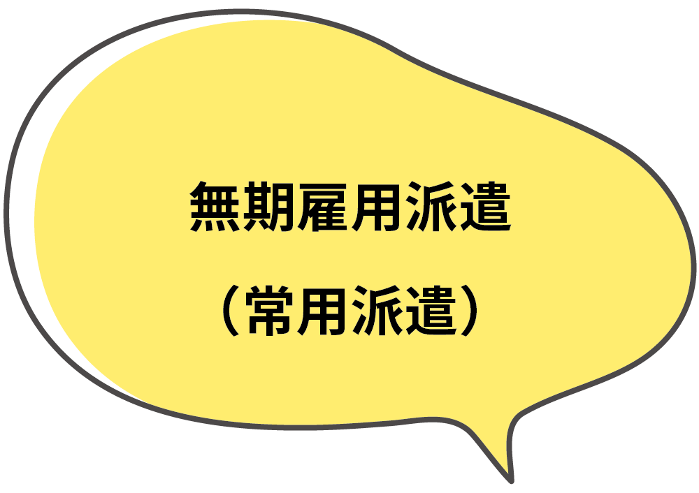 派遣会社の正社員となる契約です。一般派遣は就業期間中のみ雇用契約が発生しますが、無期雇用派遣は派遣会社の正社員であるため、就業先があってもなくても雇用契約が存在します。